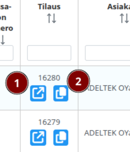 - [Uusi] Tilausten hallinta: Lisätty listanäkymään tilauksen kopiointinappi. 1 = tilauksen avaaminen, 2 = tilauksen kopioiminen.