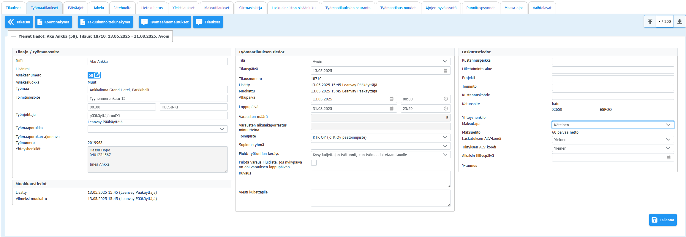 - [Uusi] Tilausten hallinta, Työmaatilaukset: Maksuehto-kenttä avattu työmaatilauksen tiedoissa, valittu maksuehto periytyy työmaan tilauksille.