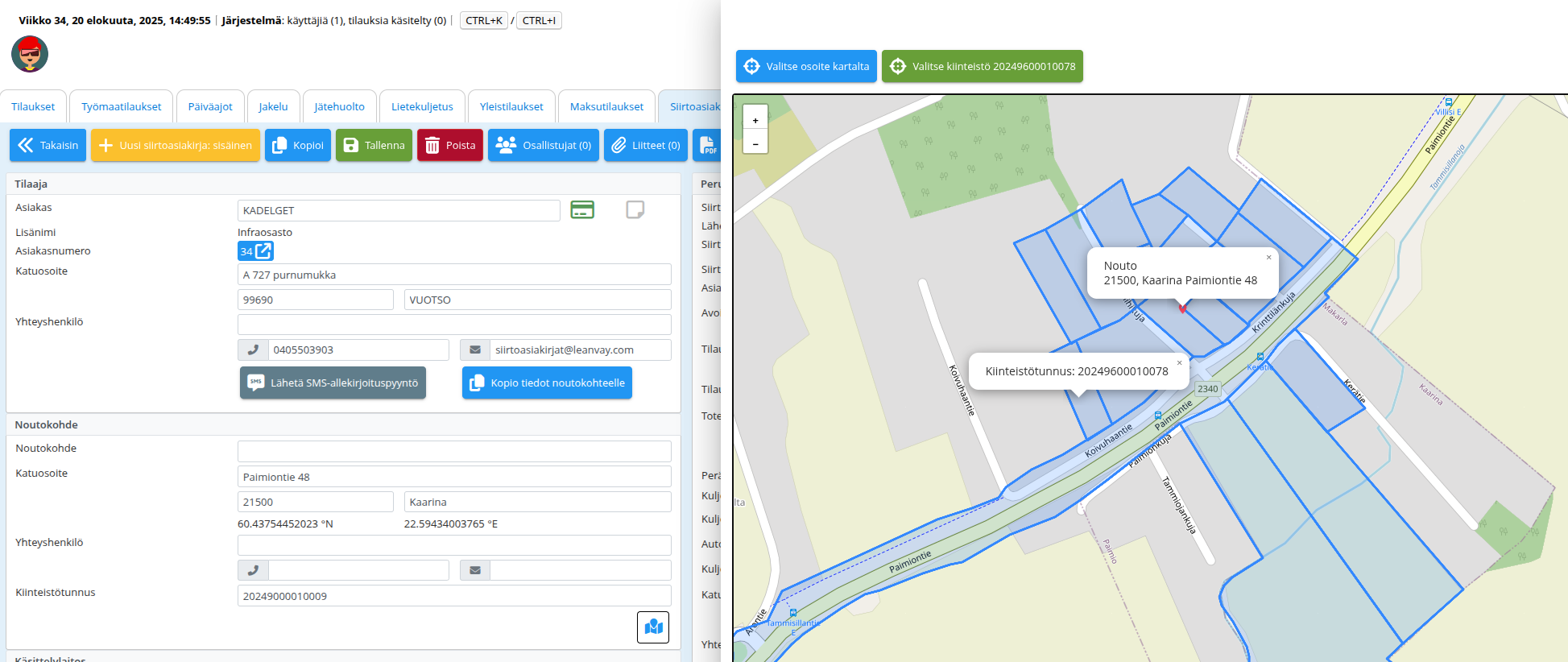- [Uusi] Tilausten hallinta, Siirtoasiakirja, siirtoasiakirjan muokkaussivu: Lisätty mahdollisuus valita kiinteistötunnus/nouto-osoite kartalta (kartta-ikoni avaa kartan). Huom: Kiinteistötunnus-kenttä näytetään siirtoasiakirjalla, jos käyttöoikeus on laitettu päälle (Asetukset, Käyttöoikeuksien hallinta: Sivujen / valikkojen hallinta, Tilausten hallinta, “Siirtoasiakirja: Kiinteistötunnus”)