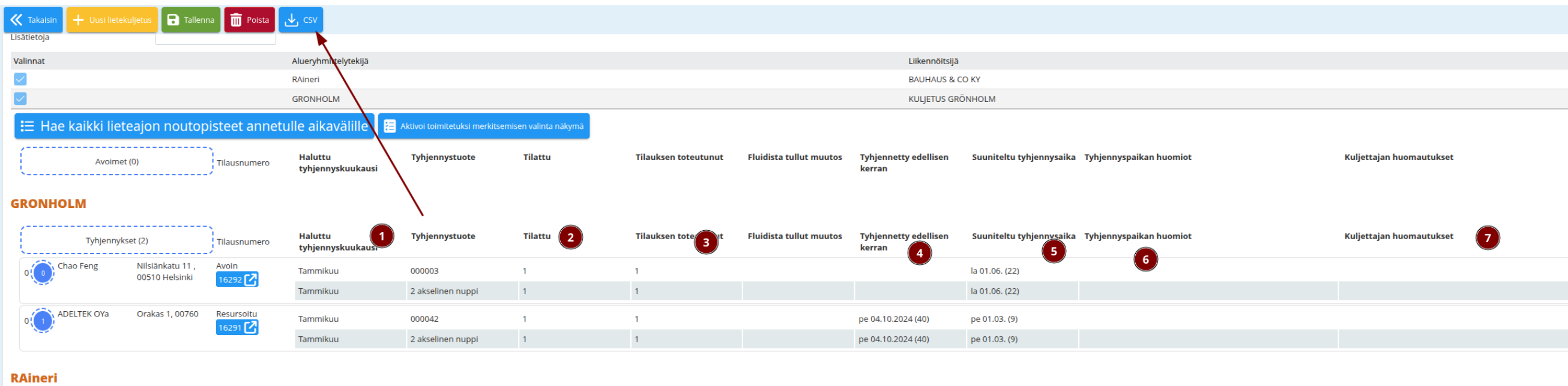 - [Muutos] Tilausten hallinta, Lietekuljetus: Lisätty CSV-tiedostoon kuvanmukaiset sarakkeet.