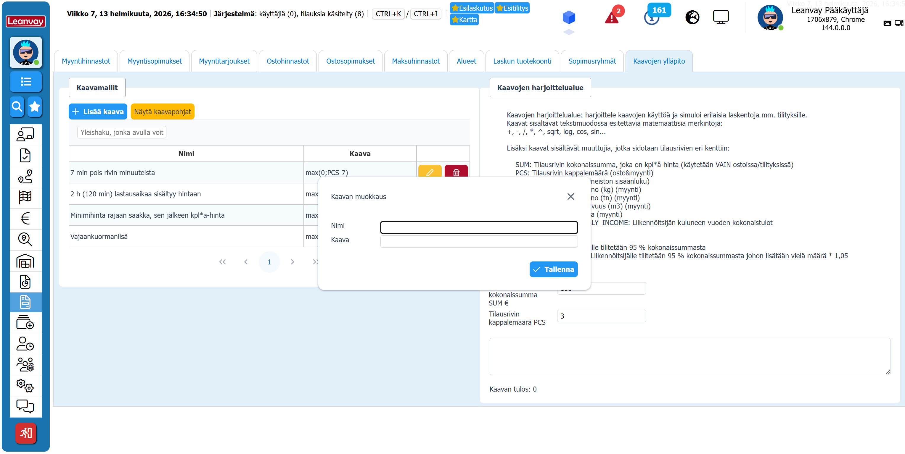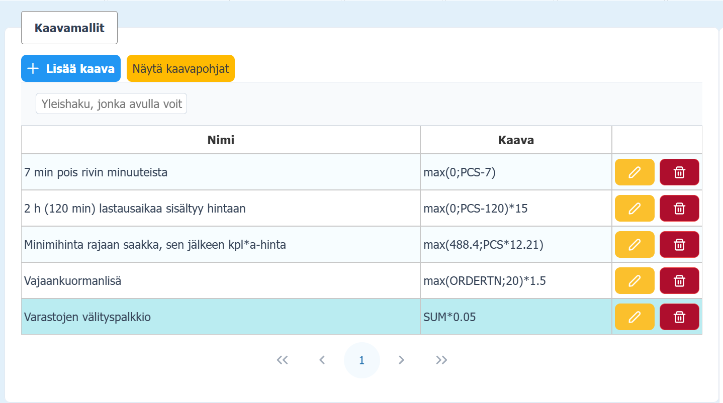 Kaava ilmestyy listalle. Sitä voi muokata keltaisesta napista ja sen voi poistaa punaisesta napista.