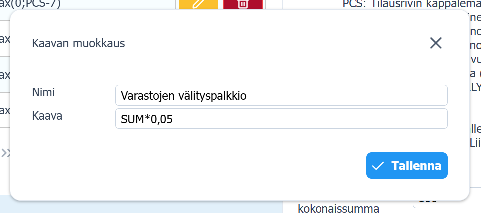 Kun varastoihin liittyvistä tilityksistä halutaan tehdä välityspalkkiovähennys, luodaan ensin kaavoihin haluttu kaava. Kaavoja luodaan ja muokataan Hinnastot-osiossa, Kaavojen ylläpito -välilehdellä.
