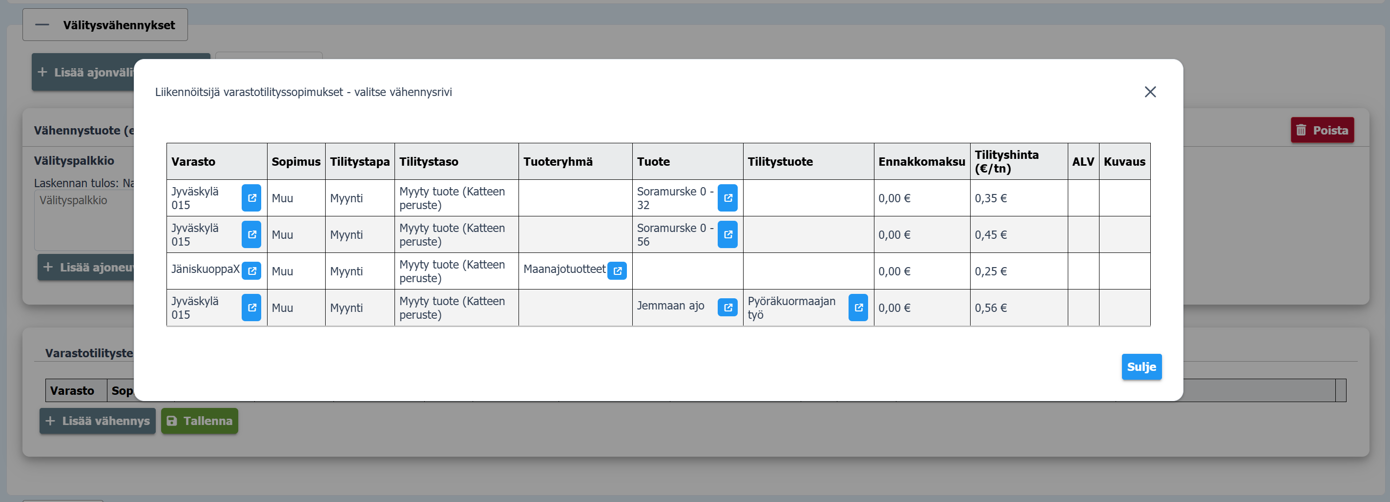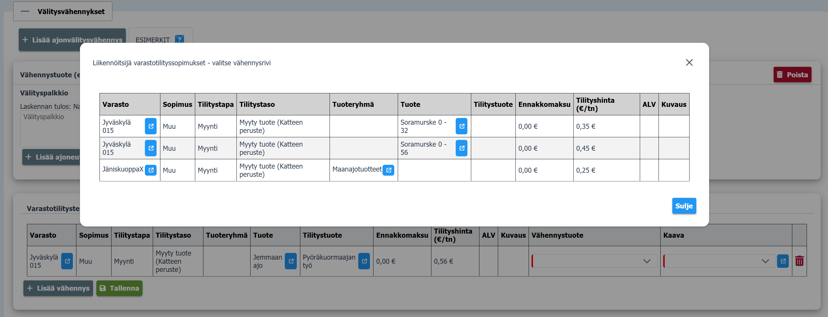 Sulje popup, jos et halua valita enempää rivejä. Valitse riville vähennystuote ja kaava, paina lopuksi vihreää “Tallenna”-nappia.