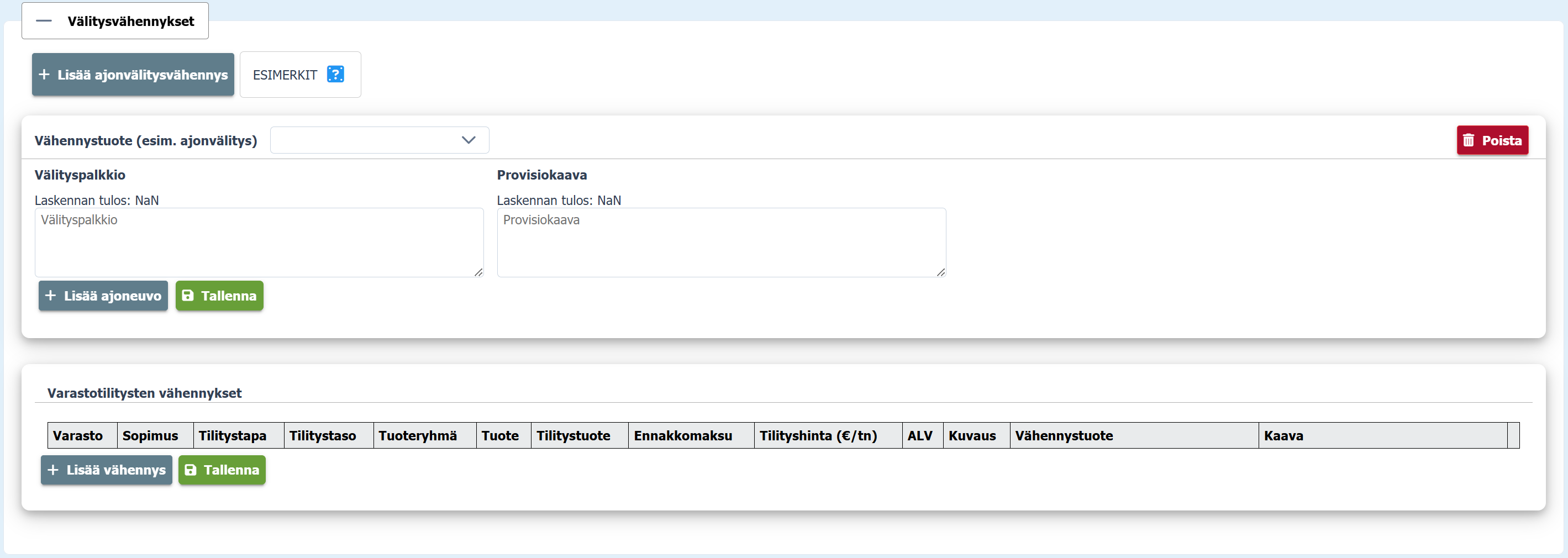 Mene sitten sen liikennöitsijän ostosopimukselle, jolle haluat luoda välitysvähennyksen. Välitysvähennykset-kohdassa on ajoneuvovälitysvähennyksille oma paikkansa ja varastotilitysten vähennyksille omansa: